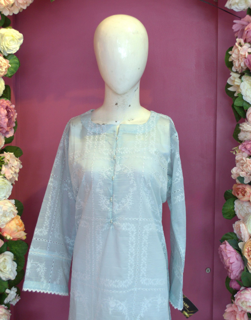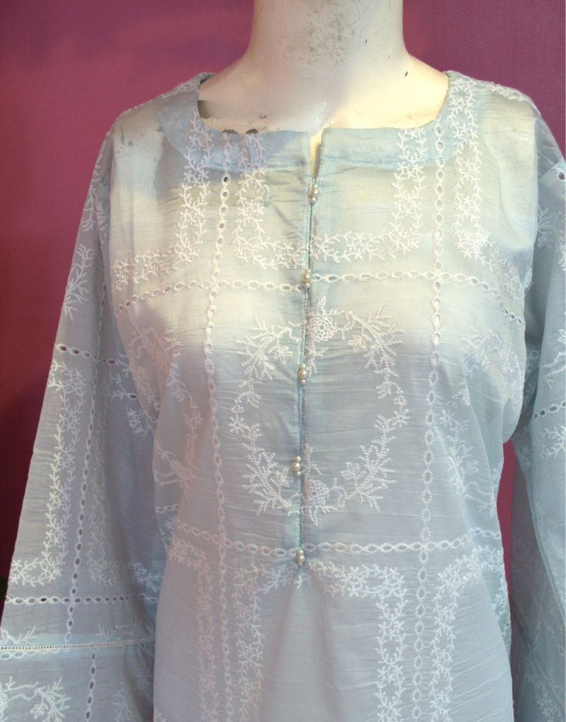Blue Chicken Kari showcases delicate embroidery on a serene blue canvas, blending artisanal charm with timeless elegance.