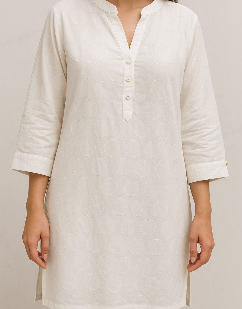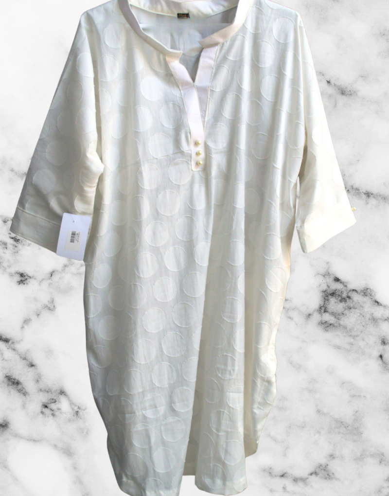 Timeless white suit with subtle embroidery, paired with matching trousers and a lightweight dupatta for an elegant, classic look.